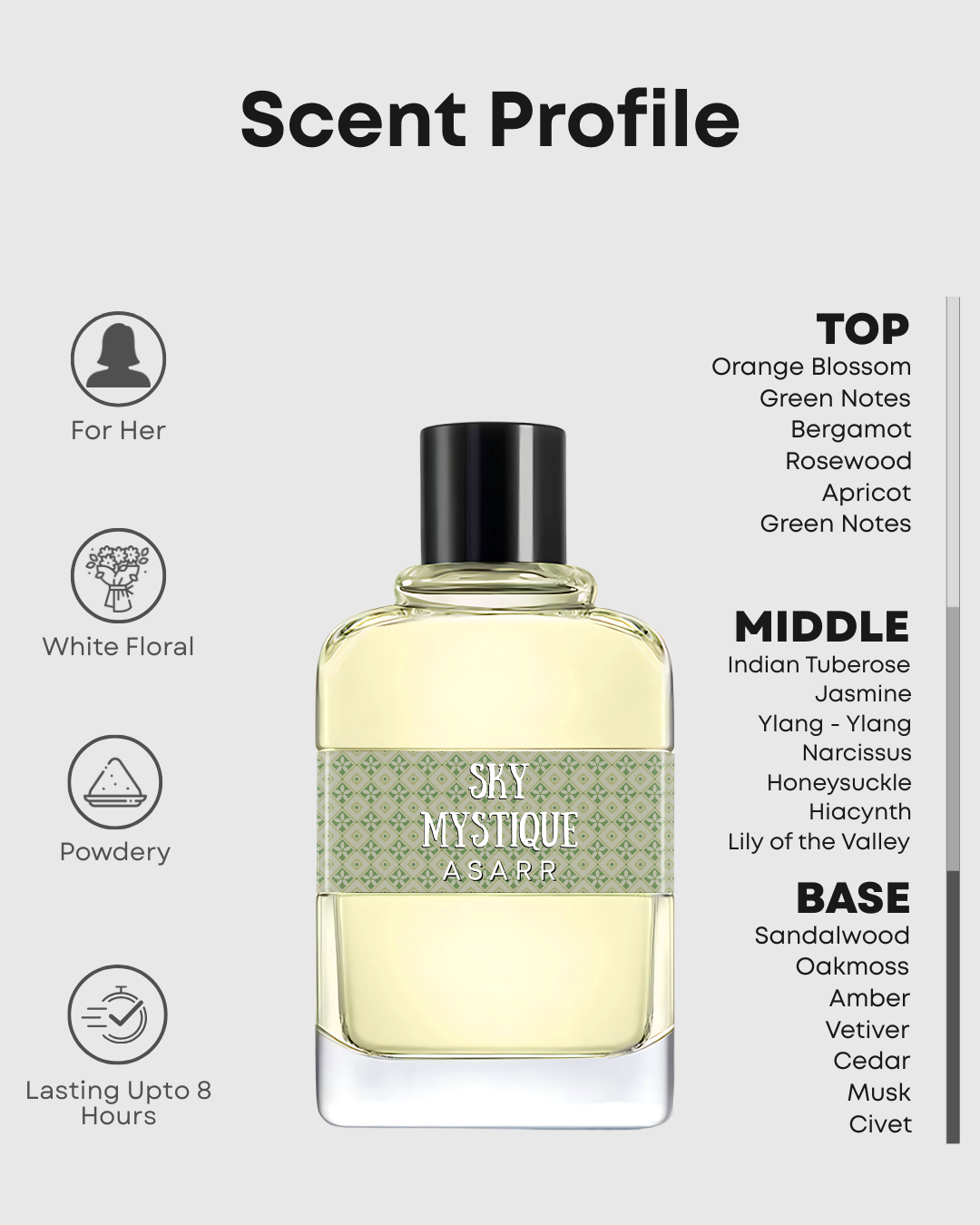 Sky Mystique captures the essence of sophistication and timeless femininity, inspired by Carolina Herrera. This elegant floral fragrance blends vibrant citrus, white florals, and warm woody undertones, creating a refined and graceful aura that lingers beautifully.